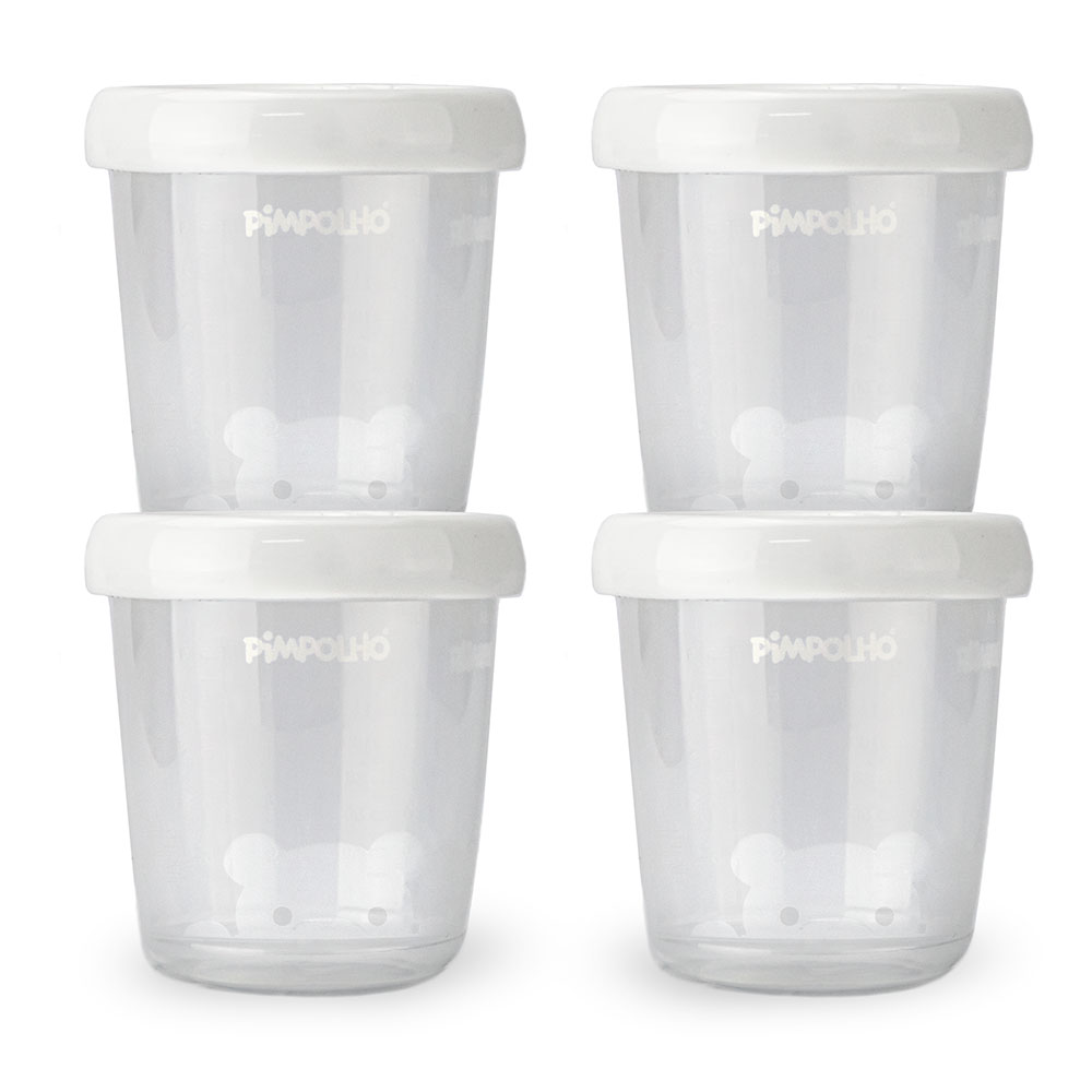 Os Potes de leite materno Pimpolho são feitos em plástico resistente a quedas, com tampa rosqueável de fechamento hermético que evita vazamentos.